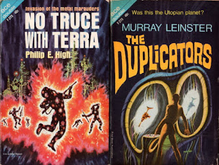 To be honest, this particular Ace Double really didn't excite me prior to reading. Murray Leinster (a pseudonym for Will F. Jenkins) was a respected old pro, but he's never been a particular favorite of mine. Philip E. High is an English writer who never became prominent: he's not really very good, but I find him something of a guilty pleasure. Leinster published 9 Ace Double halves in 8 separate books (plus a later reprint of the one Ace Double that featured him on both sides). High published 6 Ace Double halves. The Duplicators) is about 46,000 words long, and No Truce With Terra is about 34,000 words.